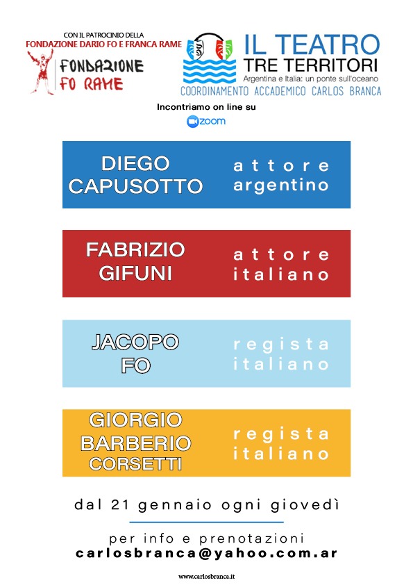 Il teatro tre territori: con l’attore argentino Diego Capusotto, l’attore Italiano Fabrizio Gifuni, il regista Jacopo Fo, e il direttore dei teatri di Roma Giorgio Barberio Corsetti. inizio 21 gennaio. Coordinamento accademico Carlos Branca.